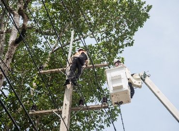 It involves installing fiber or communication cables on poles and elevated structures.